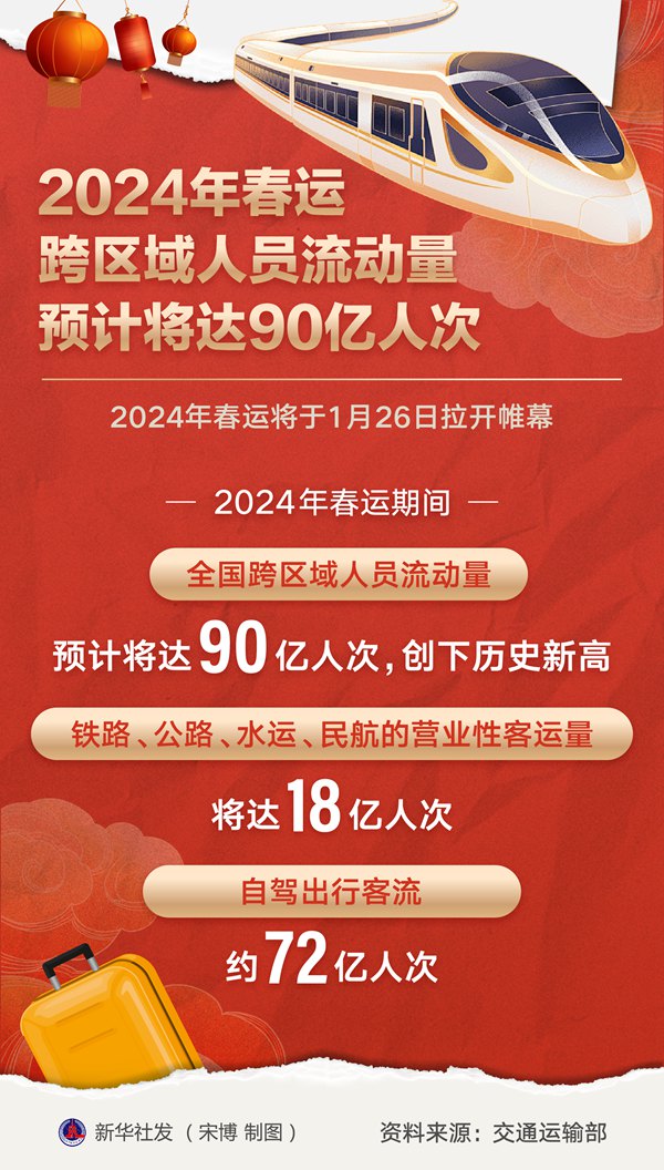 新華社北京1月16日電(記者葉昊鳴、王聿昊)2024年春運將于1月26日拉開帷幕。記者從16日召開的國新辦發布會上了解到,今年春運期間全國跨區域人員流動量預計將達90億人次,創下歷史新高。