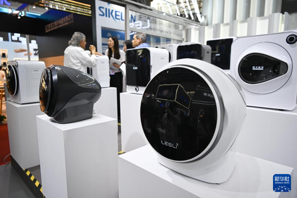 4月17日,參觀者在惠而浦智能家電展區了解洗衣機產品。新華社記者 鄧華 攝