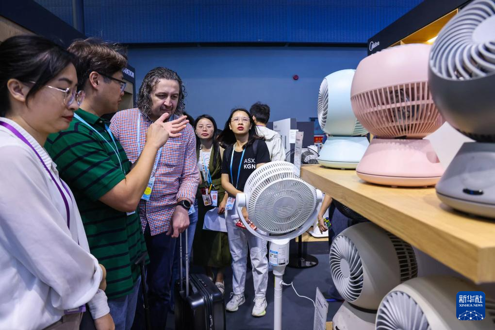 4月15日,澳大利亞采購商在廣交會智慧生活展區了解智能風扇產品。新華社記者 劉大偉 攝