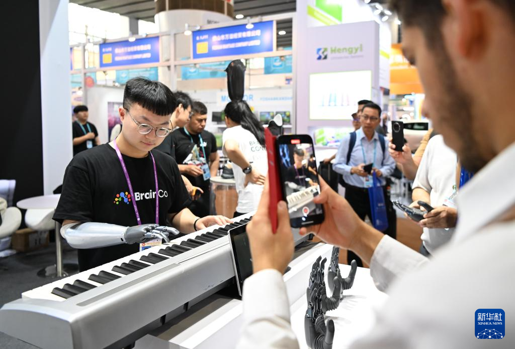 4月17日,佩戴智能仿生手的參展商工作人員在強腦科技展臺演奏電子琴。
