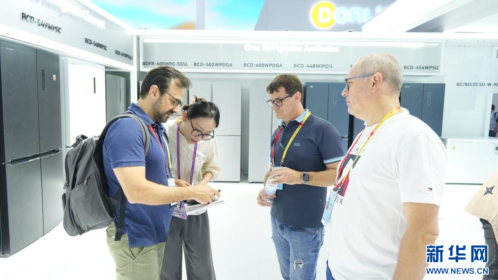 第135屆廣交會上,境外采購商在了解智能冰箱產品。新華網發(吳昊天攝)