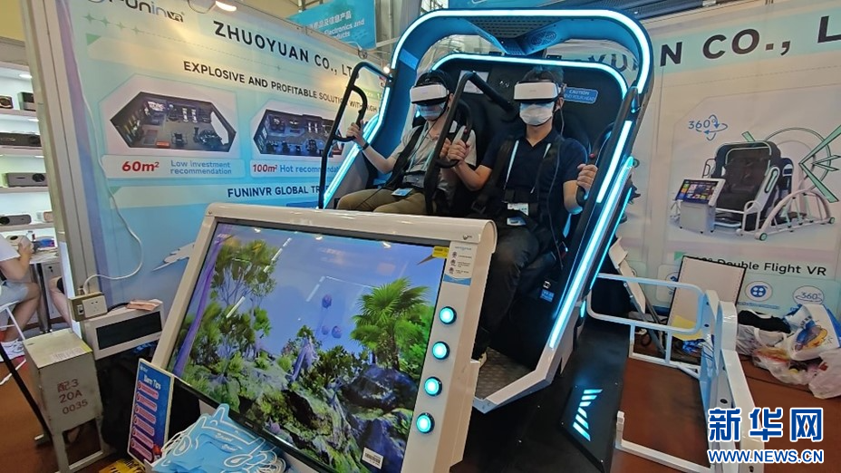 “Amazing”“Nice”……這樣的贊嘆聲在廣州卓遠虛擬現實科技股份有限公司的展位上此起彼伏。一款雙人360度旋轉VR娛樂設備和一款擁有專業級賽車模擬座艙的沉浸式漂移賽車設備,圍滿了前來體驗的采購商。