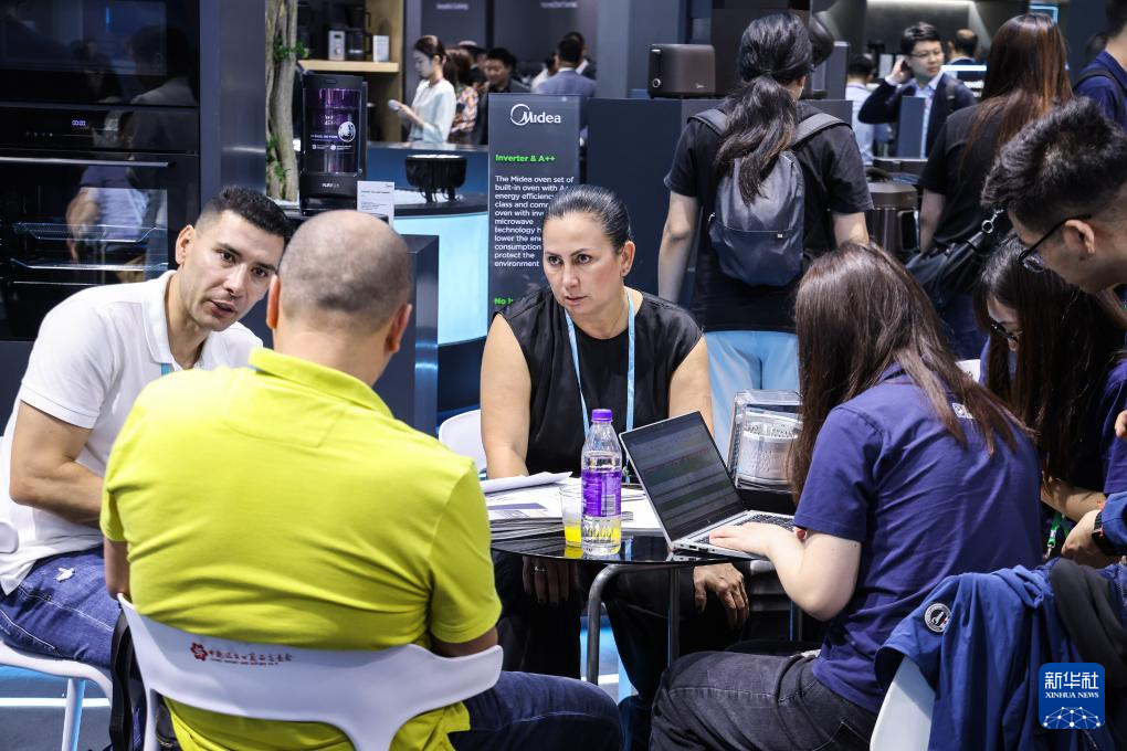 境外采購商在第135屆廣交會美的集團的展位洽談(2024年4月15日攝)。本屆廣交會參展企業中,國家級高新技術企業、制造業單項冠軍、專精特新“小巨人”等超5500家,比上屆增長20%。新華社記者 劉大偉 攝