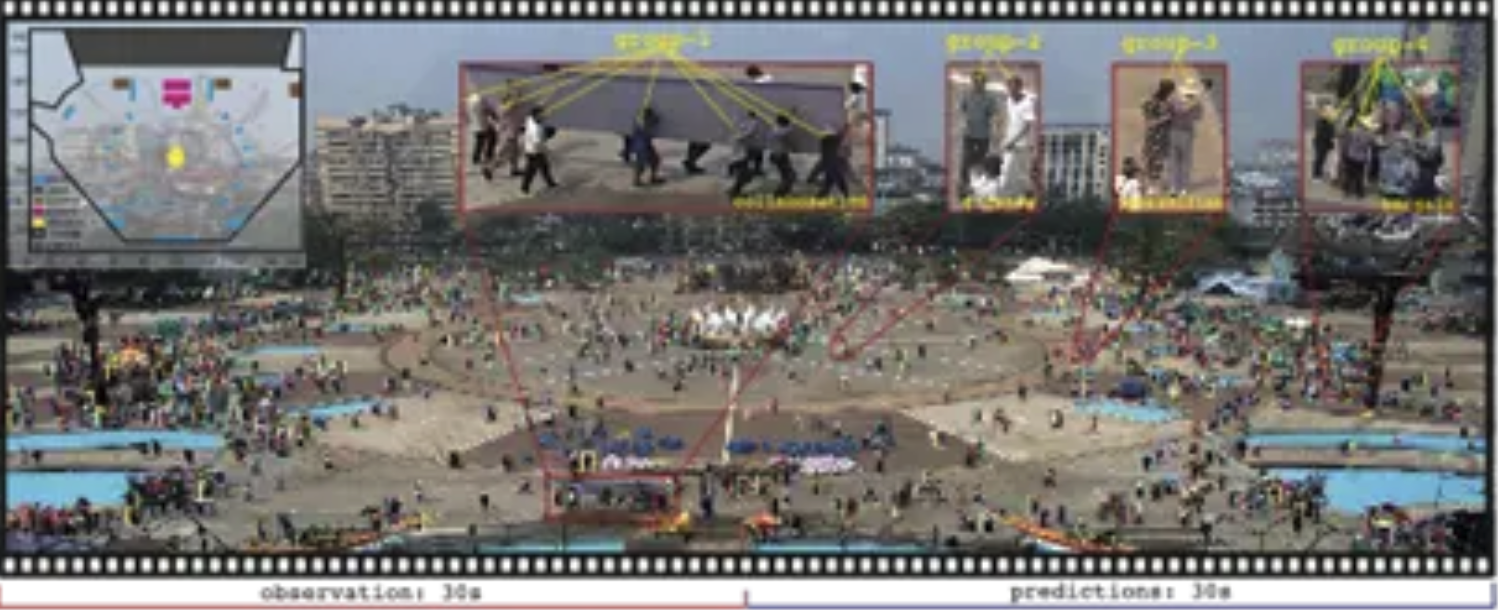 本屆GigaVision賽題基于PANDA數據集,為選手提供了復雜大場景的寬視場高分辨圖像序列(單幀涵蓋約4萬平方米場景,達十億像素級)和長時程行人軌跡(像素坐標與真實世界坐標,30秒/60幀)。要求參賽者根據給定數據,完成針對百余名行人的長程軌跡預測(30秒/60幀)。