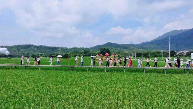 2024年6月,深汕特別合作區新里村,市民漫步于稻田的棧道上。