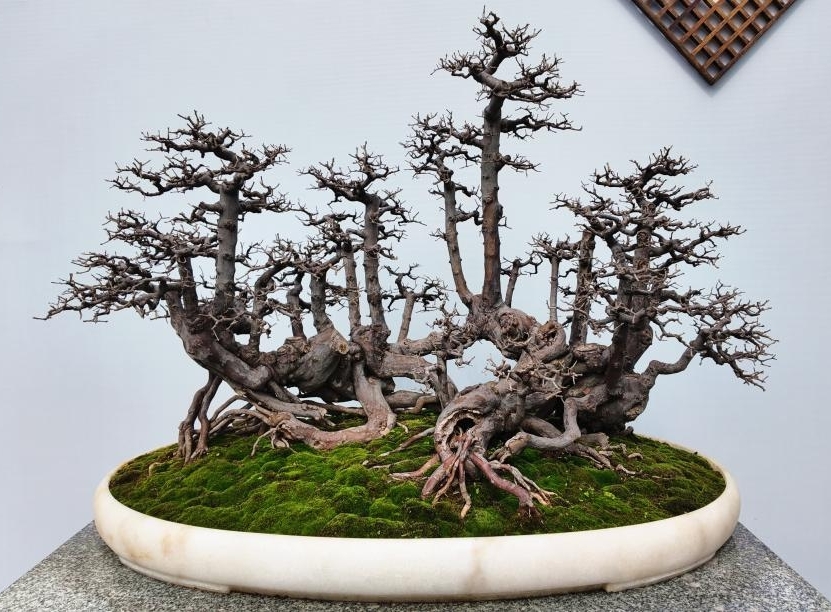 嶺南盆景的展示方式為''脫衣換錦,一展四變"。據劉光明介紹,嶺南盆景在參展時會剪光枝葉,現在冬季寒枝裸露萬物調凌為冬凌,等過10天左右,枝條萌芽、綠芽點點即春芽狀態,再過20天,芽生長成枝、枝繁葉茂即夏茂狀態,再過一段時間花果類的盆景會有果實生于枝條,一幅碩果累累的秋天景色即秋實,“所以嶺南盆景會通過一次修剪呈現四季景色變化?!?/p>