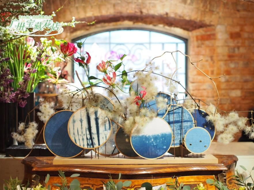 “24年想埋下一顆種子,25年想開花結果?!痹谀卫m藝術空間里,擺放著程一歡設計種子系列藝術作品。其中一個作品為德式架構花藝,設計融合了東西方文化,主花是鐵線蓮的花蕊,輔材料運用了牛仔布和藍色扎染布料,以及中國傳統材料(竹繡繃)。