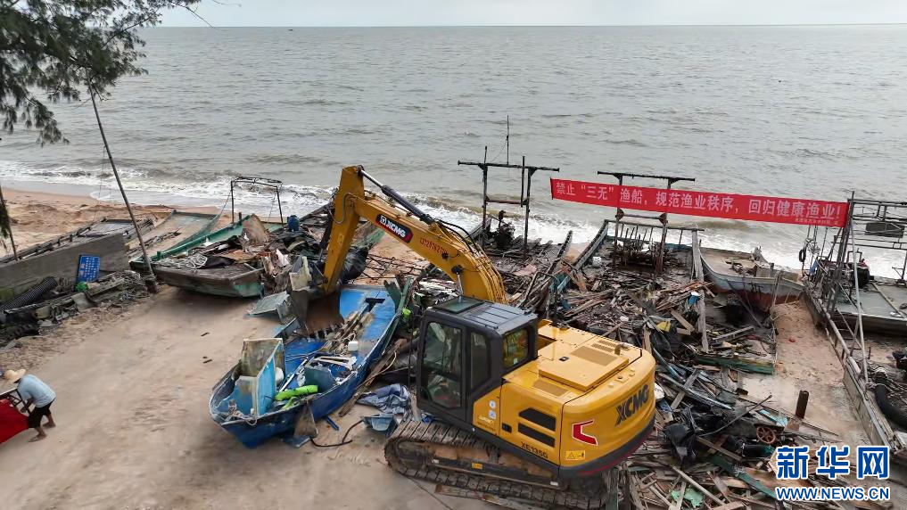 在湛江遂溪,工作人員利用大型挖掘機銷毀船舶。新華網發(廣東省海洋綜合執法總隊供圖)