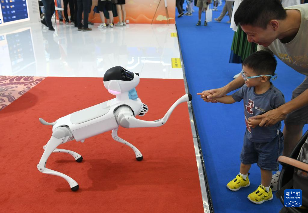9月13日,在2025廣東國際旅游產業博覽會現場,觀眾與萌寵機器狗互動。新華社發(許建梅攝)