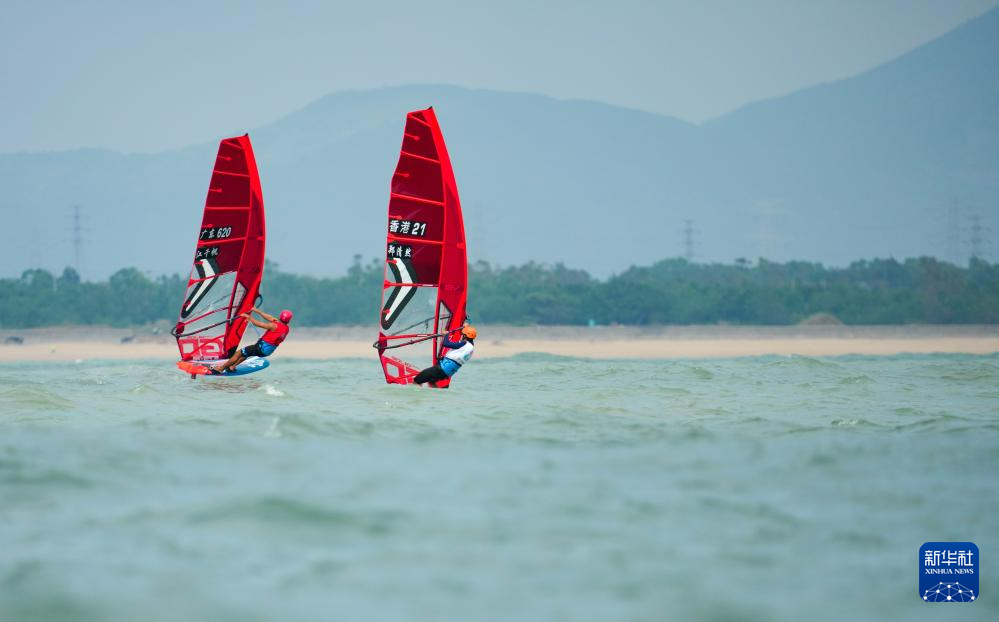 10月30日,廣東隊選手江千帆(左)和香港隊選手鄭清然在男子水翼帆板級獎牌賽中。最終,江千帆獲得季軍,鄭清然獲得第四名。