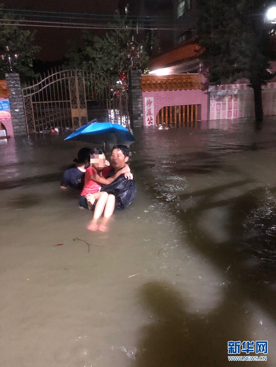 梁紹威救助被洪水圍困的孩子。新華網發