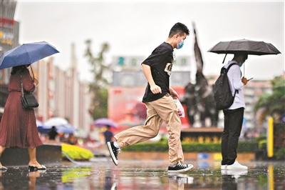 昨日傍晚,客村附近,沒帶傘的行人冒雨匆匆行走。廣州日報全媒體記者陳憂子攝