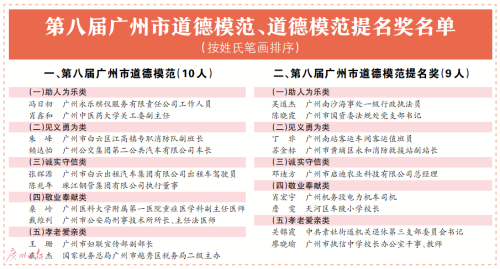 記者從廣州市文明辦獲悉,第八屆廣州市道德模范、道德模范提名獎評選結果于日前揭曉,馮日初等10人被授予第八屆廣州市道德模范稱號,吳道杰等9人被授予第八屆廣州市道德模范提名獎稱號。