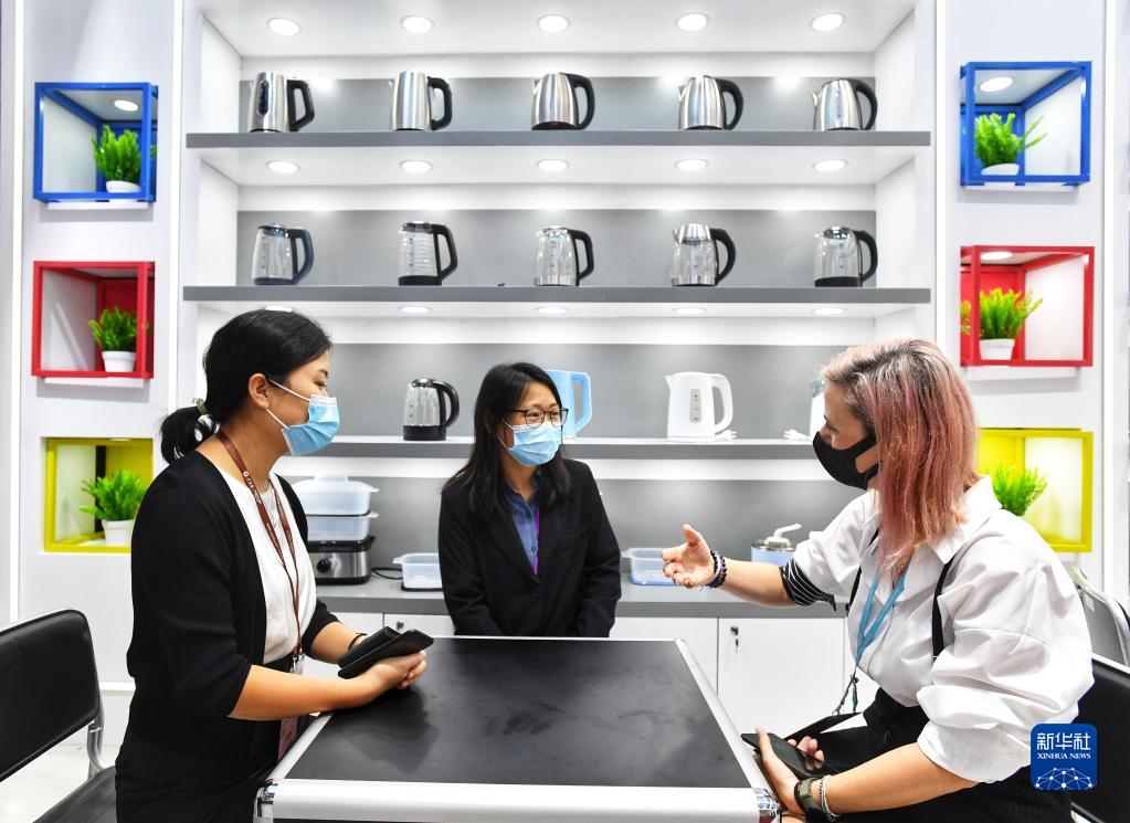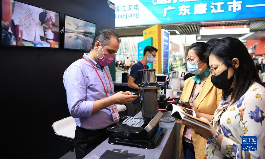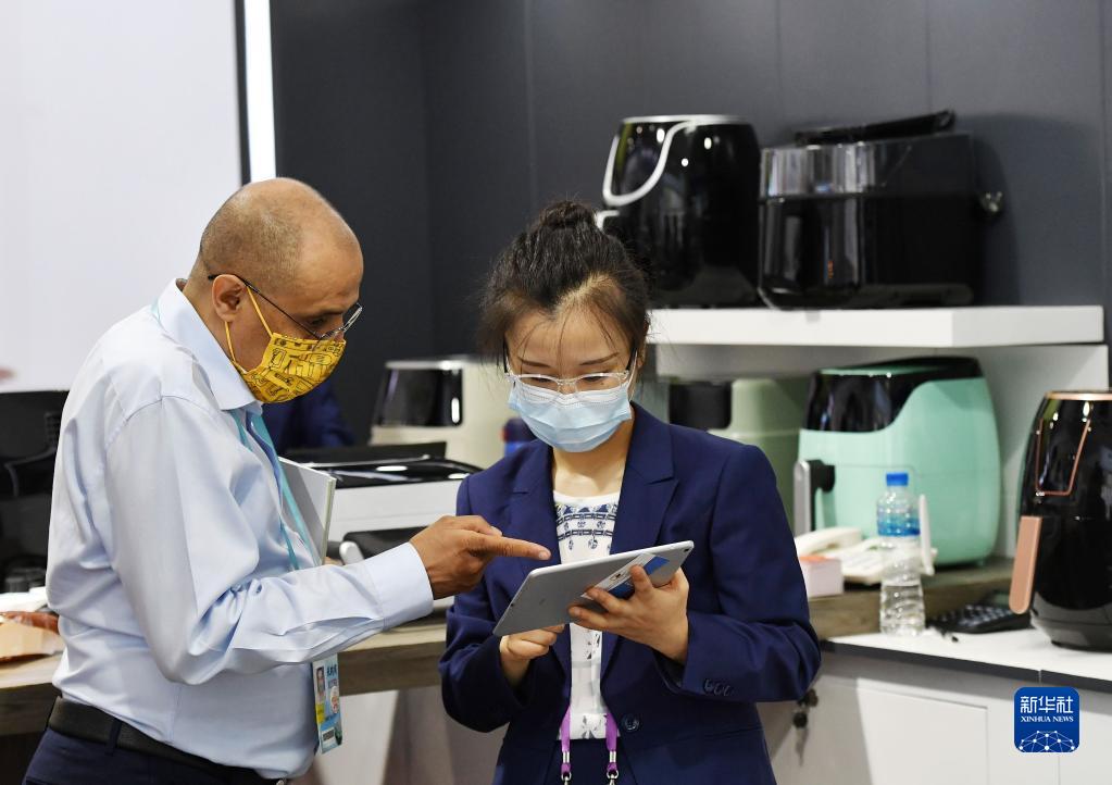 10月15日,一名國外采購商(左)在廣交會上和一家小家電展商洽談。