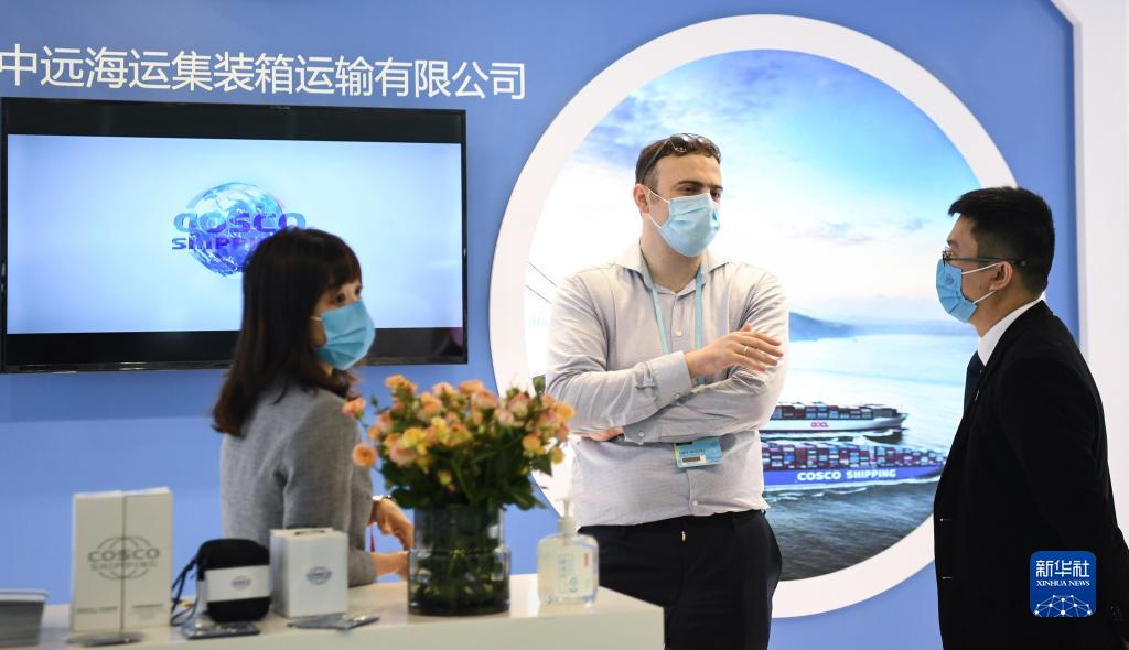 10月15日,一名國外采購商(中)在中遠海運展臺洽談。新華社記者 鄧華 攝