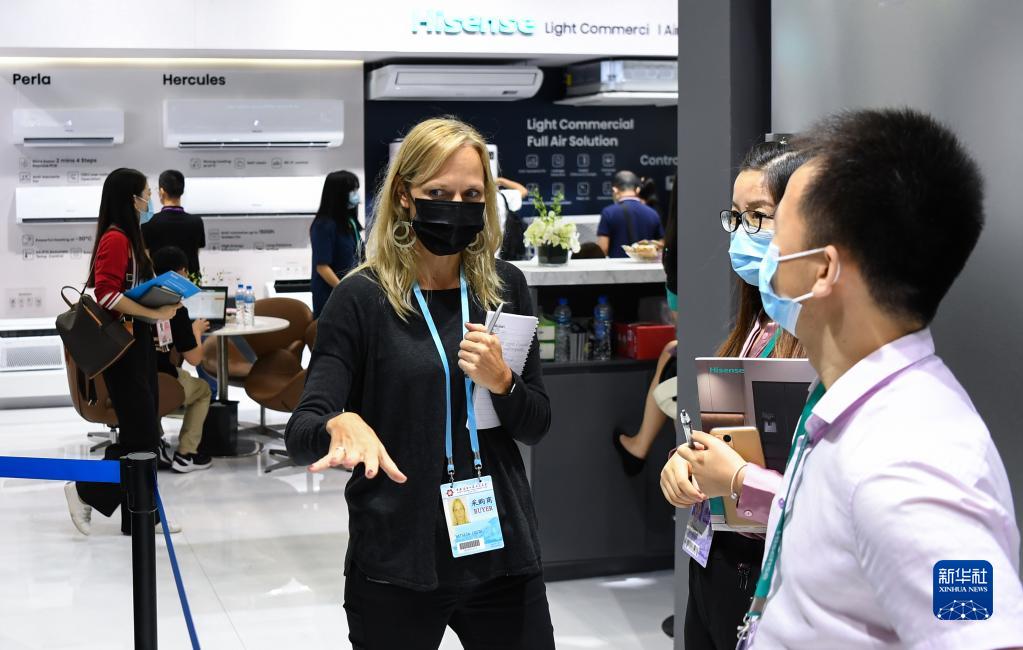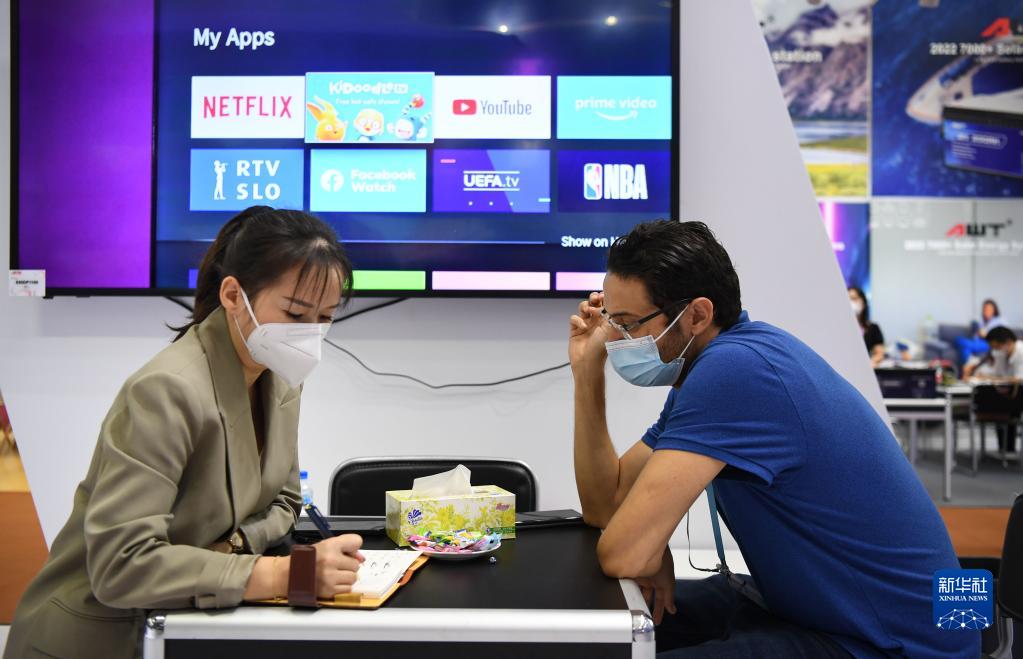 10月15日,一名國外采購商(前左)在海信展臺洽談。新華社記者 鄧華 攝
