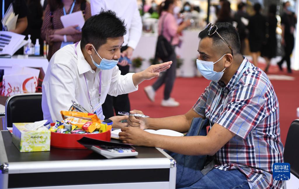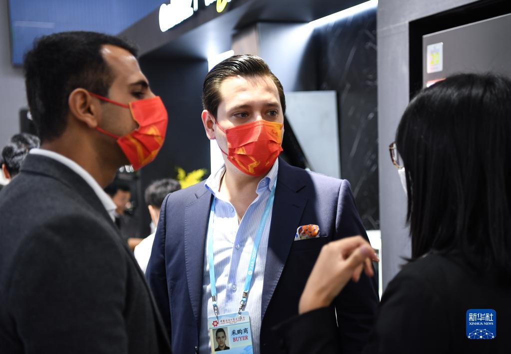 10月15日,一名國外參會者(中)在廣交會上和展商洽談。新華社記者 劉大偉 攝