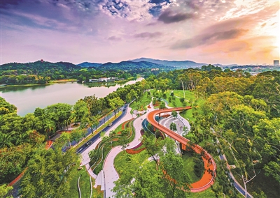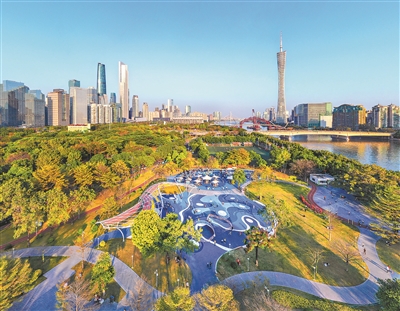 綠的是草樹。森林公園、濕地公園、城市公園、社區公園、口袋公園……各類公園,體量不一、形態各異,像一串串珍珠、一塊塊藍寶石,鑲嵌在花城之中。人行城市間,穿綠踏青,仿在畫中游。道路兩旁,綠樹成蔭;大廈四鄰,綠草茵茵。推窗見綠,出門進園,活在廣州,活在公園里。