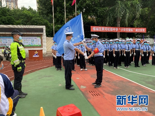 近日,揭陽交警走進榕城區新河初級中學開展廣東“少年交警隊”創建活動。成立儀式上,法宣科科長潘少偉為“少年交警隊”授旗。