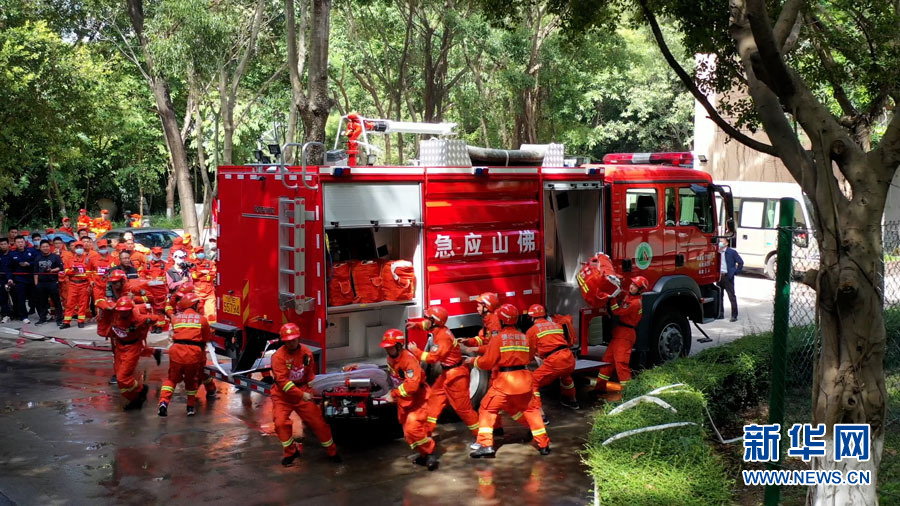 參賽隊伍在泵車結合以水滅火、定向越野識圖用圖、3000米野外負重跑等五個項目上展開比拼。圖為泵車結合以水滅火比賽現場。新華網發