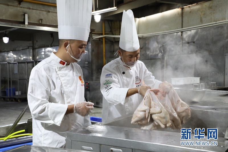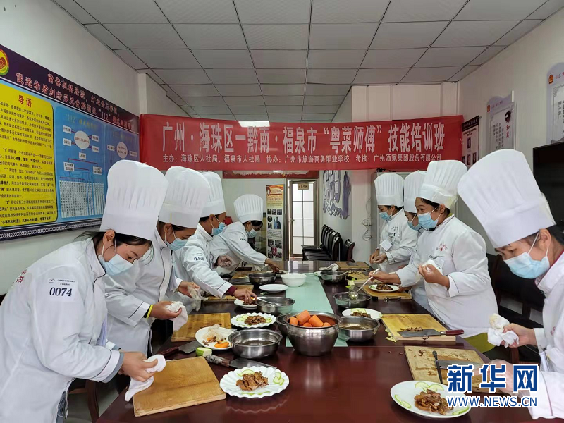 “我們的培訓敞開大門,只要有興趣的人都隨時可以來學習?!辟囀闲值苷f,如今他們已經培養10多個徒弟,參與粵菜師傅項目培訓的學員也超3000人。圖為師徒交流技藝。新華網 陳雪瑩/文 林曉蕾/圖