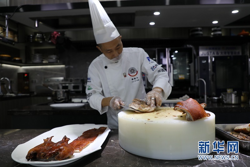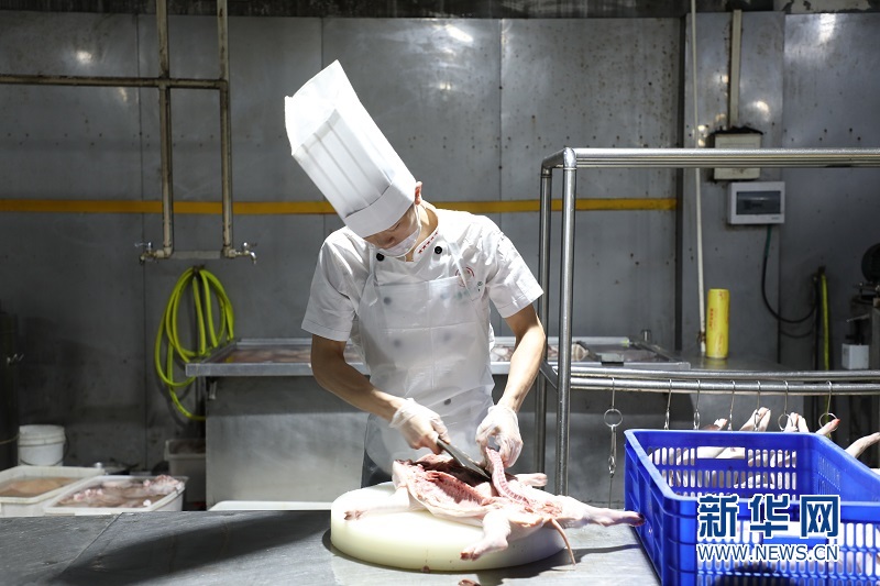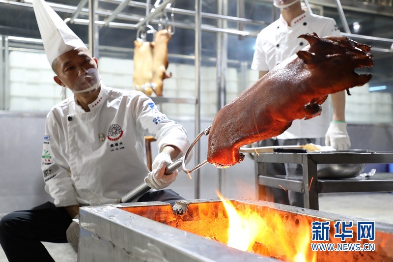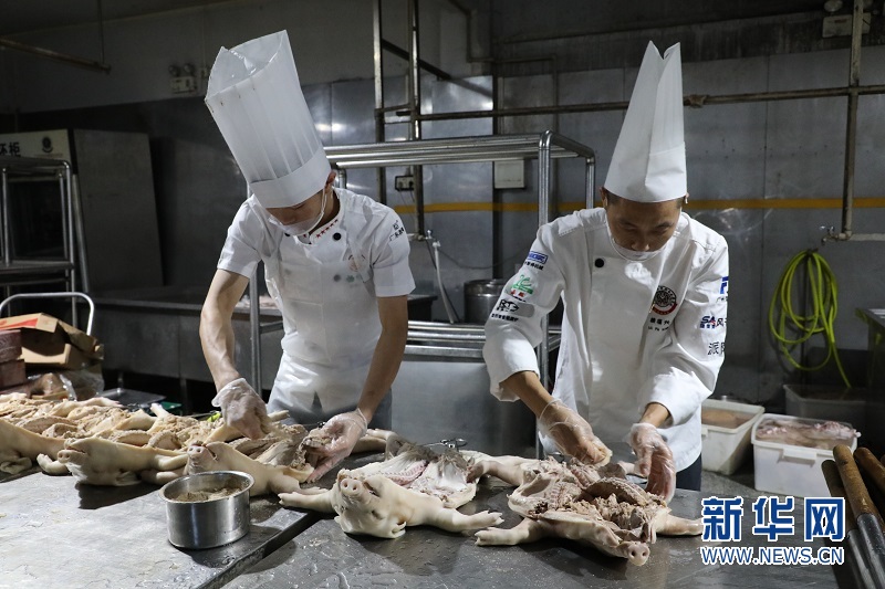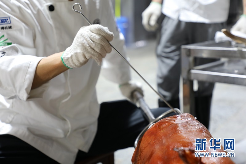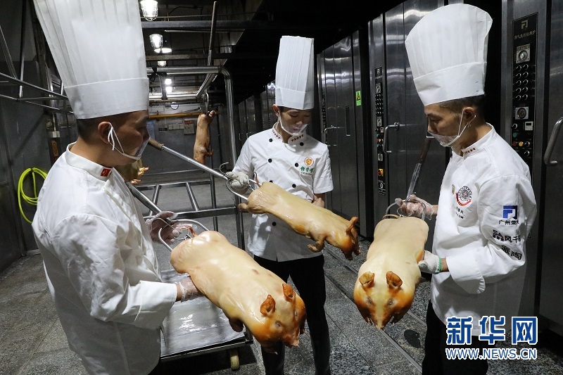 “我們都是‘過來人’,很想幫助勞動就業群體掌握一技之長,實現高質量就業創業,在致富路上大顯身手?!辟囀闲值苷J為,包括燒臘在內的粵菜制作存在流程不規范、用料多少全憑廚師感覺等問題。為此,他們聯合廣東烹飪協會燒臘專業委員會制作了一套廣式燒臘的工藝流程,用于粵菜師傅的培養。圖為烹飪“脆皮乳豬”。新華網 陳雪瑩/文 林曉蕾/圖