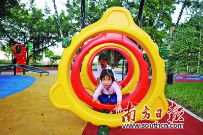斗門持續推進農村人居環境整治,將田園風光、人文景觀和現代文明融于一體。圖為孩子們在斗門上洲村生態公園內游玩。關銘榮 攝