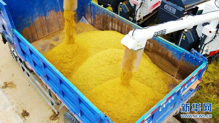 在鰲頭鎮,村民駕駛收割機在收割晚稻。新華網發(鄧靜西攝)