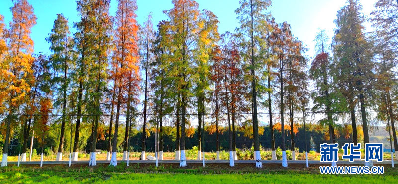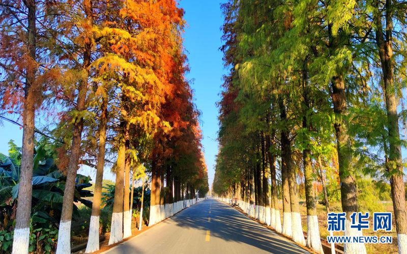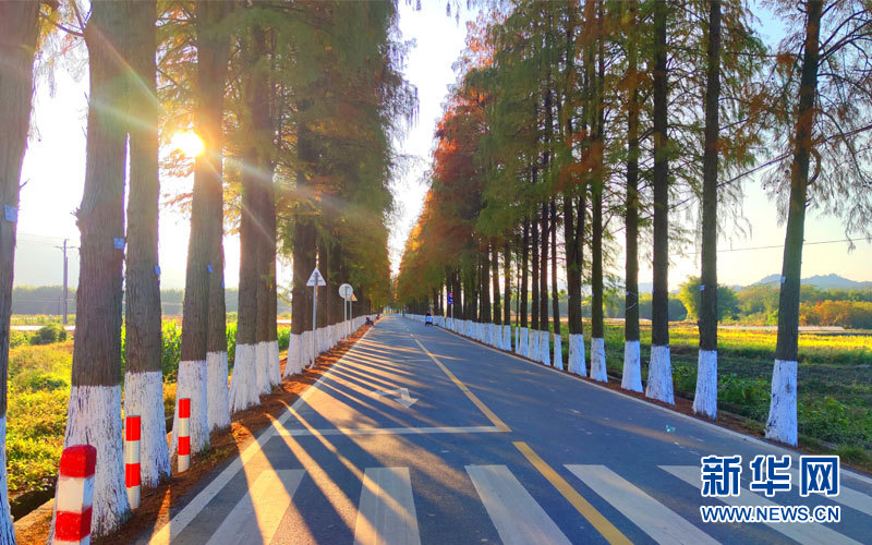 隨著天氣逐漸轉冷,韶關市始興縣X344線全長22公里的道路兩邊,落羽杉開始慢慢褪下碧綠“妝顏”,轉成紅褐色。新華網發
