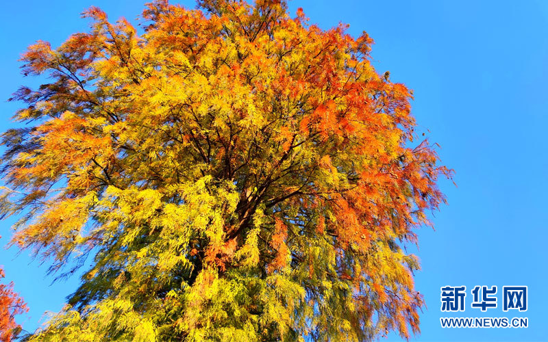 每年11月到次年2月份左右,落羽杉從綠色變成黃色、黃色變成紅色、紅色又變成深紅色。新華網發