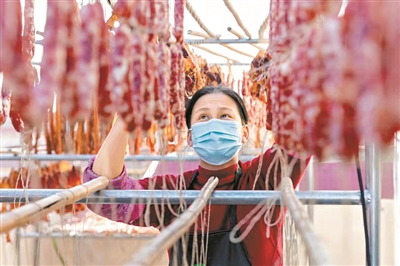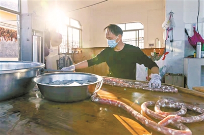 據蘇老板介紹,蘇記臘味吸引最多回頭客的產品為臘腸。臘腸的原料為精選的新鮮豬肉,肥瘦比例為2:8口感最佳。肥肉需要提前腌制后切成肉粒,而瘦肉則不用腌制,切碎加入一定量的白糖、鹽、高度米酒、醬油即可與肥肉粒攪拌。臘腸經過灌腸、扎孔、扎繩等工序,晾曬5~6天即可上市。手工制作的臘腸,色澤好、口感佳,不甜不咸,無論是用來煮煲仔飯還是炒菜都風味獨特,老少皆宜。