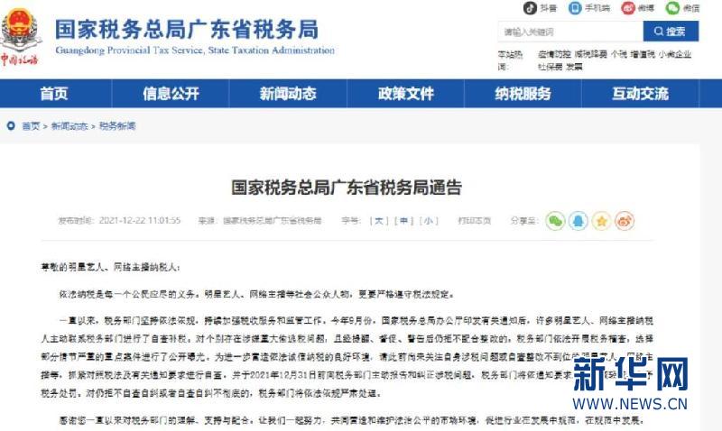 新華網廣州12月22日電 12月22日,國家稅務總局廣東省稅務局官網發布通告,要求明星藝人、網絡主播等年底前主動報告和糾正涉稅問題。