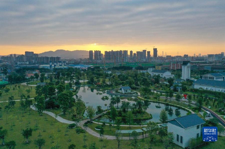 這是晨曦中的廣州石井凈水廠區(無人機照片,11月19日攝)。在這片園林地下17米深處,日處理能力30萬噸的凈水廠正24小時運轉。新華社記者 劉大偉 攝