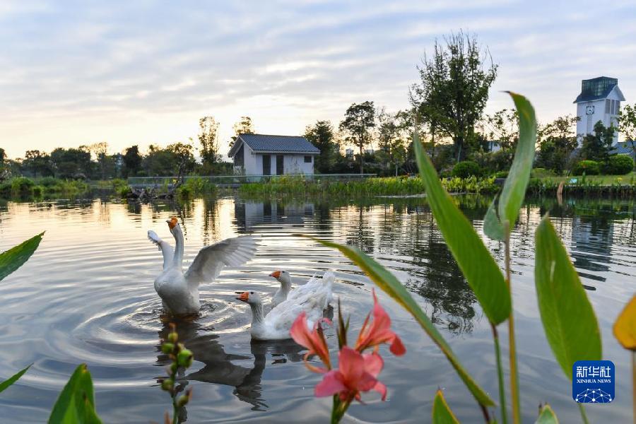 幾只大白鵝在廣州石井凈水廠的池塘中悠閑游弋(11月19日攝)。這個建造在凈水廠區的園林已經向市民預約開放。新華社記者 劉大偉 攝