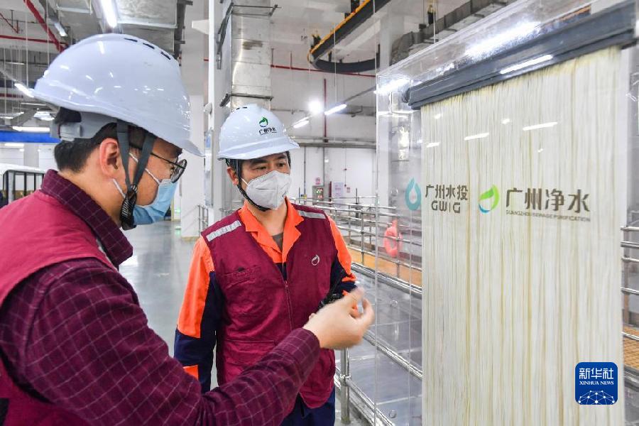 兩位技術人員在廣州西朗凈水廠地下車間查看過濾膜絲,這種膜絲過濾技術可以更加高質高效凈化污水(12月21日攝)。新華社記者 劉大偉 攝
