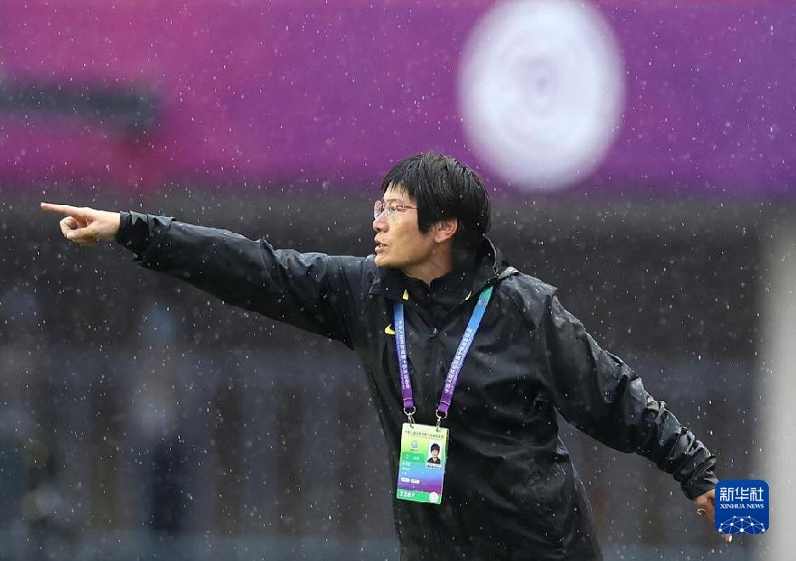9月18日,在第十四屆全運會足球項目女子成年組小組賽中,時任聯合隊主教練水慶霞在比賽中指揮。新華社記者賈浩成攝