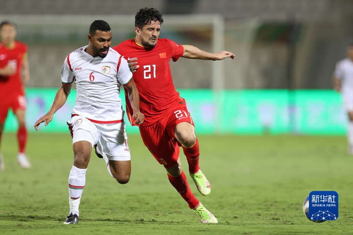 11月11日,中國隊球員洛國富(右)與阿曼隊球員艾哈邁德·哈米西在比賽中拼搶。新華社發