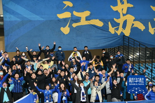 2020年12月12日,江蘇蘇寧易購隊球迷在看臺上為球隊加油。新華社發史康攝