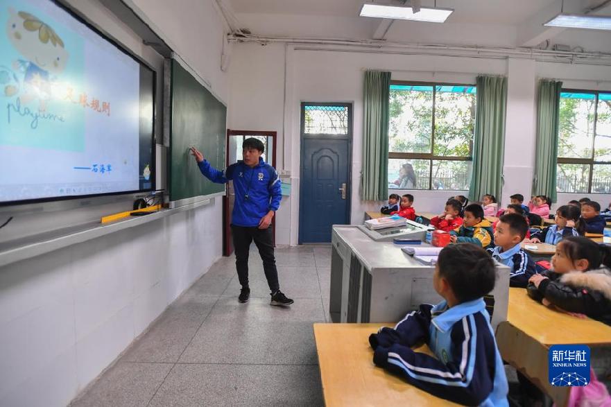 12月3日,在長沙市雨花區德馨園小學,足球老師石海軍給一年級學生上足球理論課,講解足球規則。新華社記者陳澤國攝