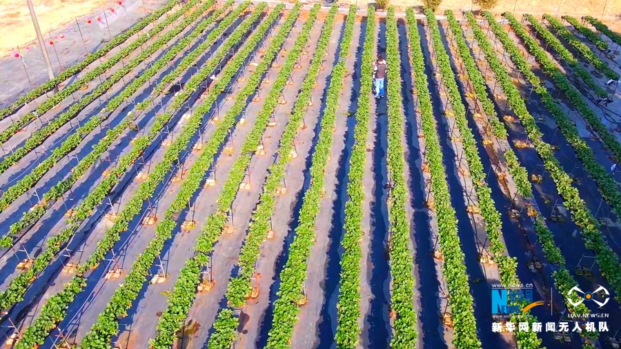 暖陽下,一排排高一米左右的架子上,草莓正散發著香甜的味道。新華網發(黃利誼 攝)
