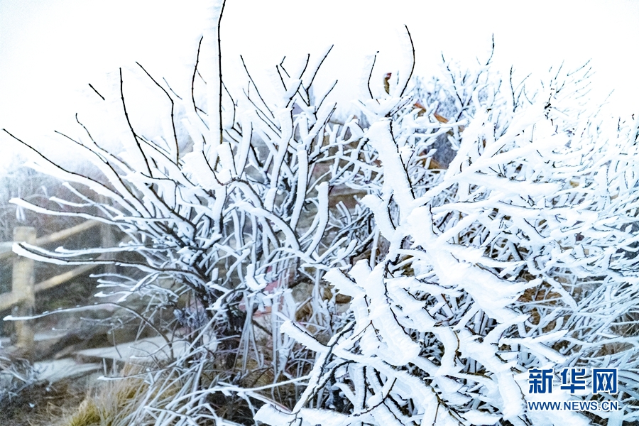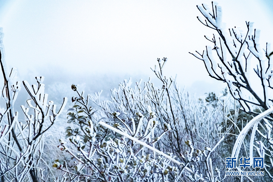 枝頭的霧凇形態各異,宛如瓊樹銀花漫天開放。新華網發(曾令華 攝)