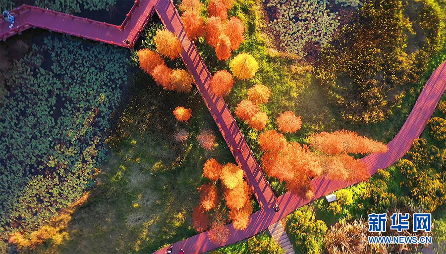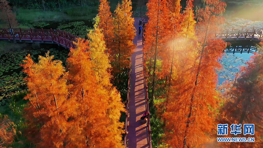 從空中俯瞰,深深淺淺的紅色與金色交織,如油畫般美麗,吸引不少游客前來觀賞游玩。新華網發(陳冠游 攝)