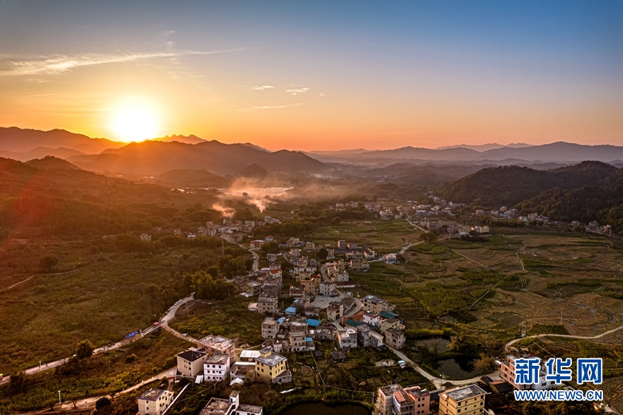 在朝霞的掩映下,炊煙裊裊喚醒沉睡的村莊。新華網發(黃敏生攝)