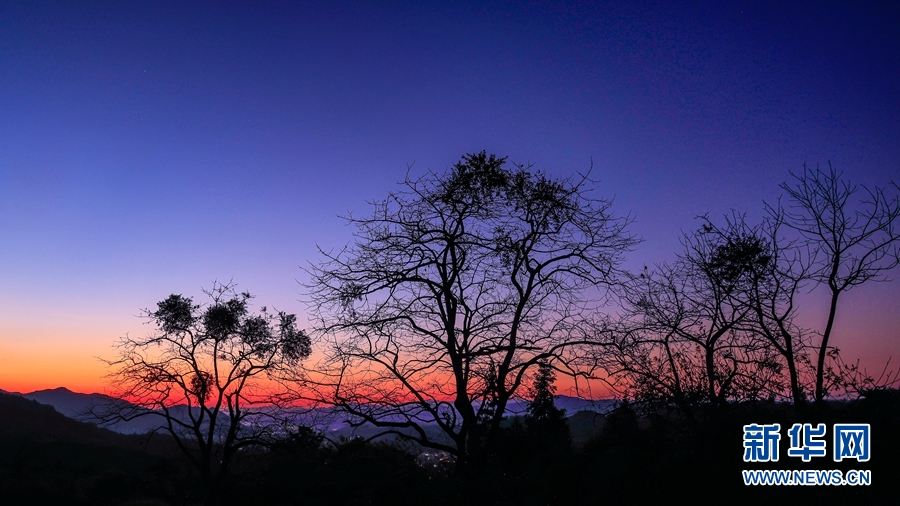 落日余暉中,樹木與山川被籠罩在一片橙紅色的暖意里,為冬日的戶外平添了幾分別樣詩意。新華網發(黃敏生 攝)