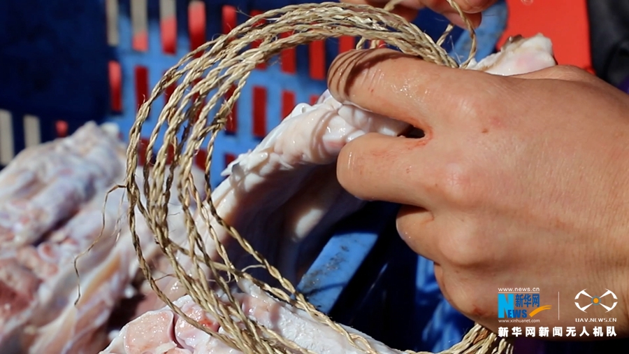 生曬臘味是當地人的傳統,村民正在制臘味。新華網發(羅素玲 攝)