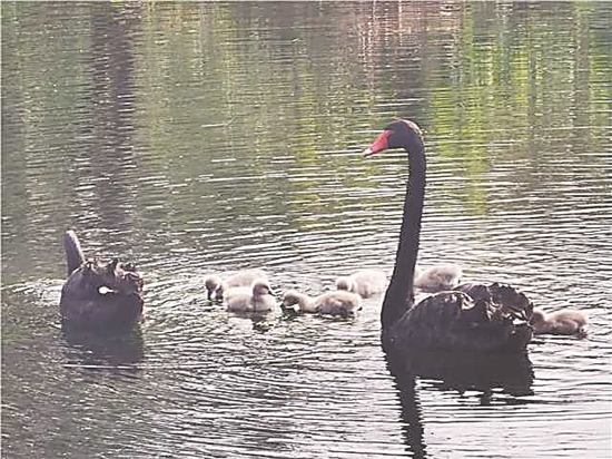 近日,工作人員巡園的時候驚喜地發現它們原來已經升級為寶爸寶媽,其中一對黑天鵝還孵化出七只小寶寶,出現在鷺島景區的湖面上(上圖)。