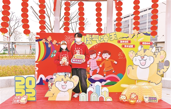 新春佳節,在惠州市博羅縣園洲鎮的欣旺達惠州新能源產業園里,處處喜氣洋洋、年味濃濃,多個新春打卡點放置著金元寶、小燈籠、萌虎公仔等小道具,吸引了不少職工拿起手機拍照留念。