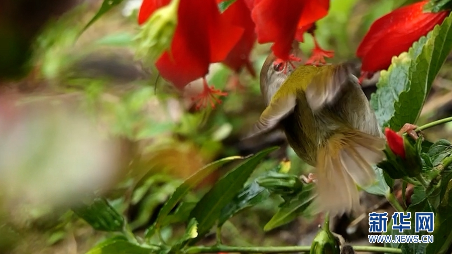 盛開的花朵吸引鳥兒棲息覓食。新華網發(佘建新 攝)