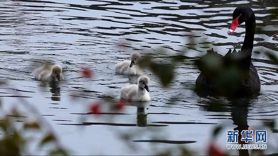 優雅美麗的天鵝媽媽和寶寶在水里暢游。新華網發(佘建新 攝)