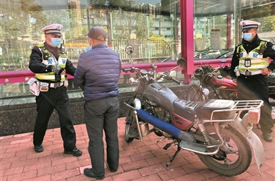 廣州地鐵南洲站A出口附近,一名男子駕駛摩托車被執勤交警查獲。廣州日報全媒體記者邱偉榮攝